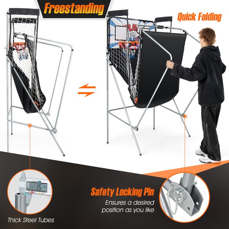 4.Foldable and Durable Iron Construction: It’s easy to fold up by removing the latch pin. After folding, this sturdy iron basketball arcade machine saves space close to 50%, making it easier for storage. And this powder coated iron tube made machine is able to withstand continual use for years.